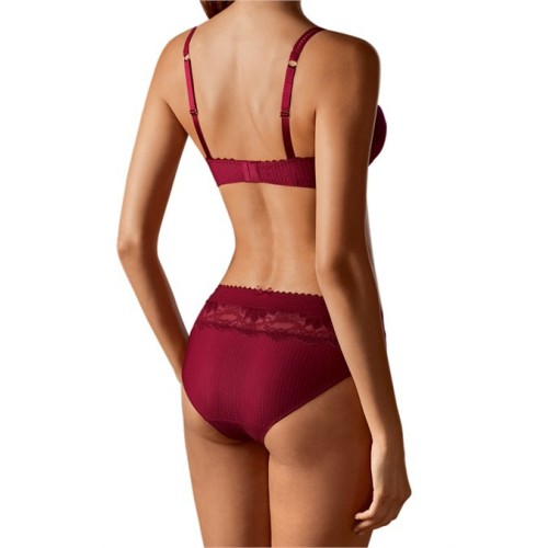 Неотразимый мягкий бюстгальтер без косточек в ярком и насыщенном цвете буругунд. Идеален для ежедневного ношения. Роскошный цвет идеально сочетается с легим кружевом, декорирующим низ лифа, чашечки и переходящим на бретели. Модель бюстгальтера богата на разнообразные декоративные элементы, делающими его неповторимым.