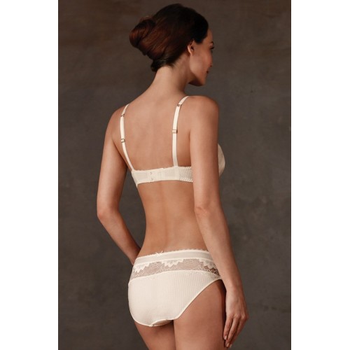 Великолепный бюстгальтер на косточках в легком кремовом цвете. Удобная модель для ежедневного ношения. Нежный пастельный цвет идеально сочетается с таким же легим кружевом, декорирующим низ лифа, чашечки и переходящим на бретели. Модель бюстгальтера богата на разнообразные декоративные элементы, делающими его неповторимым.