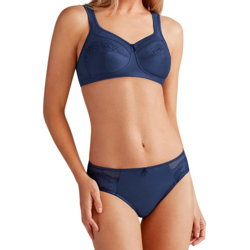 Мягкий закрытый бюстгальтер с вшивными чашечками в сдержанном синем цвете. Модель выполнена без косточек, верхняя часть чашечек декорирована прозрачной сеткой.