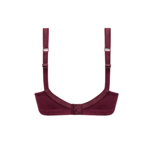 Мягкий закрытый бюстгальтер с вшивными чашечками в благородном цвете буругунд. Модель для ежедневного ношения выполнена без косточек, верхняя часть чашечек декорирована плотным непрозрачным кружевом. Следует заметить, что чашечки имеют анатомическую форму, что позволяет придавать груди идеальную форму и давать всю необходимую поддержку.