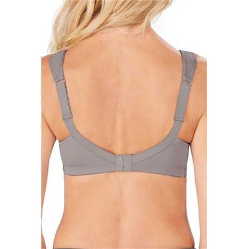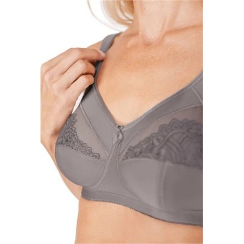 Мягкий закрытый бюстгальтер с вшивными чашечками в приятном сером цвете. Модель для ежедневного ношения выполнена без косточек, верхняя часть чашечек декорирована плотным непрозрачным кружевом. Следует заметить, что чашечки имеют анатомическую форму, что позволяет придавать груди идеальную форму и давать всю необходимую поддержку.