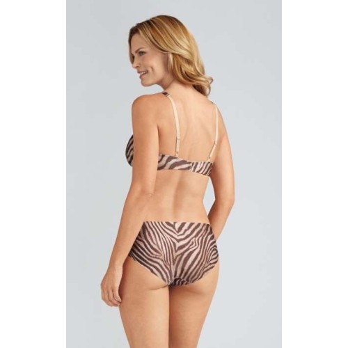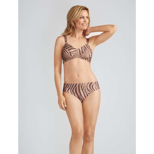 Стильный мягкий бюстгальтер с полосатым принтом в сдержанных коричневых и бежевых тонах. Его закрытая форма и отсутствие косточек дает максимальный комфорт и свободу при ежедневном ношении. Оригинальная расцветка делает этот бюстгальтер неповторимым в новой коллекции, несмотря на простую форму без излишеств.