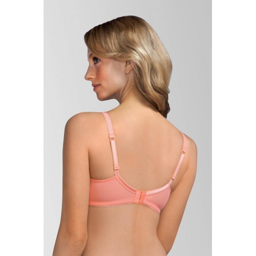 Очаровательный бюстгальтер персикового цвета на косточках, декорированный кружевом и вышивкой на чашечках. Бретели с бантиком выглядят очень женственно, удобно регулируются спереди.