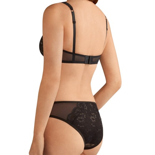 Великолепный кружевной бюстгальтер с мягкими чашечками. Выполнен из изящного черного кружева на бежевой подкладке , создавая иллюзию прозрачности и легкости модели.