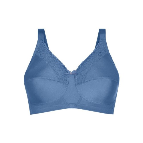 Мягкий комфортный бюстгальтер на каждый день нежного приятного голубого цвета. Модель выполнена без косточек. Декольте лифа украшено красивым широким кружевом в тон.