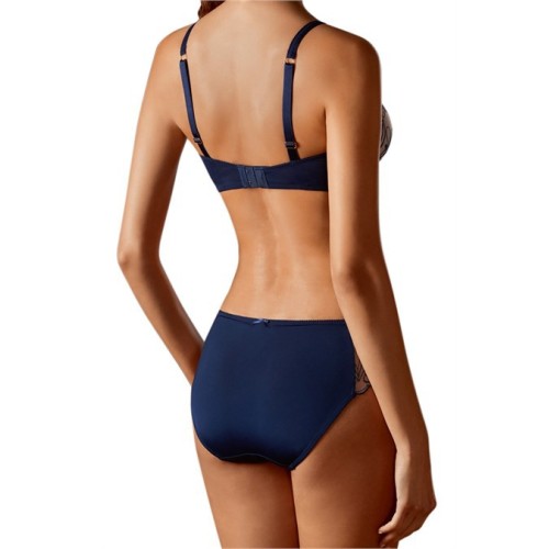 Роскошный бюстгальтер в контрастном сочетании темно-синего и бежевого. Удобная мягкая модель без косточек, подходящая для ежедневного ношения. Светлые чашечки красиво выделяются на темно синем фоне бюстгальтера, украшены фантазийным рисунком. Бюстгальтер украшен ажурным краем в зоне декольте. Спинка однотонная, темно-синяя.