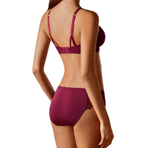 Сногсшибательный яркий бюстгальтер на косточках, выполненный насыщенного винного цвета буругунд. Чашечки выгодно оттделаны непрозрачным кружевом и добавляют элегантности и роскошности лифу. Бюстгальтер имеет ажурный край в зоне декольте и по низу лифа.