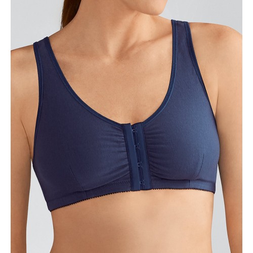 Мягкий и удобный хлопчатобумажный бюстгальтер насыщенного синего цвета. Модель предназначена для послеоперационного периода, она снабжена широкой застежкой спереди и комфортной фиксацией груди и протеза. Широкие бретельки и особенная мягкость материала позволяют носить модель в течение всего дня без дискомфорта и неприятных ощущений.