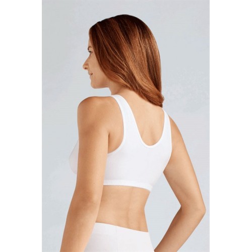 Мягкий хлопчатобумажный бюстгальтер классического белого цвета для послеоперационного периода с удобными застежками спереди и комфортной фиксацией груди и протеза. Широкие бретельки и особенная мягкость материала позволяют носить модель в течении всего дня без дискомфорта и неприятных ощущений.