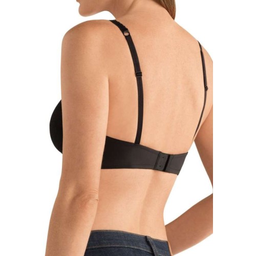 Привлекательный в своей простоте черный бюстгальтер с формованными чашечками и широким прозрачным кружевом на декольте. Красиво маскирует и делает незаметными послеоперационные шрамы или ожоги после терапии.