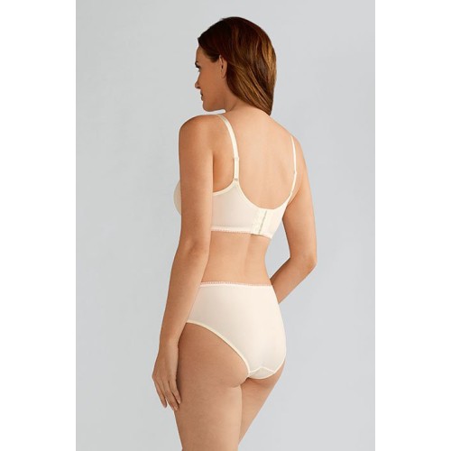 Бюстгалтер выгодно отличается широкой задней частью, которая плотно фиксирует его на теле, плавно распределяя нагрузку. Задний замочек снабжен 5-ю крючками. Дополняет модель и делает ее вид воздушным тонкие лямочки, удобно регулирующиеся по длине.