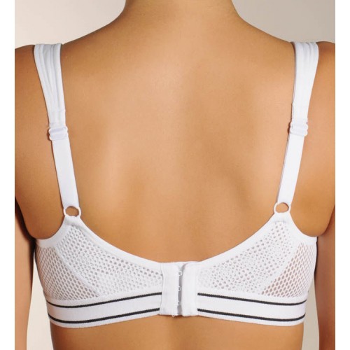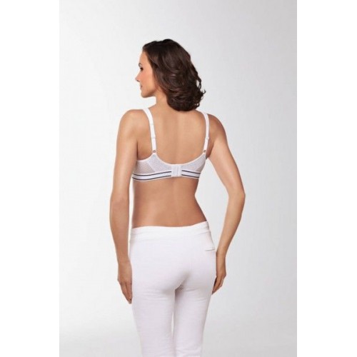 Удобный эластичный бюстгальтер для спорта белого цвета. Предназначен для женщин, которые любят активный образ жизни. Модель имеет мягкие чашки с усиленными вставками сбоку и в нижней части; чашки обеспечивают прекрасную поддержку груди и протеза.