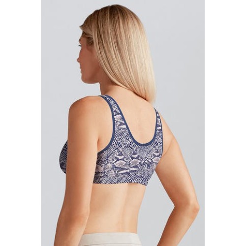 Мягкий хлопчатобумажный бюстгальтер оригинального цвета синий питон для послеоперационного периода с удобными застежками спереди и комфортной фиксацией груди и протеза. Широкие бретельки и особенная мягкость материала позволяют носить модель в течении всего дня без дискомфорта и неприятных ощущений.