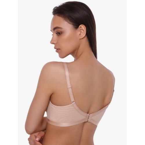 Бюстгальтер Конфиденс Ламбада красивый и изящный с кружевом цвета латте. Формованные чашки. Без косточек. Завышенная линия декольте маскирует неровности и асимметрию.