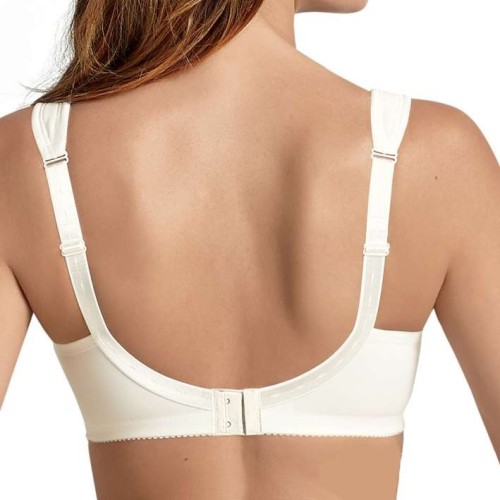 Бюстгальтер дает комфортную поддержку груди благодаря высоким боковым элементам и закрытой форме спереди. Широкие лямки эластичны, снимают нагрузку со спины и удобно регулируются по длине.