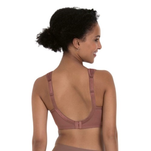 Бюстгальтер дает комфортную поддержку груди благодаря высоким боковым элементам и закрытой форме спереди. Широкие лямки эластичны, снимают нагрузку со спины и удобно регулируются по длине.