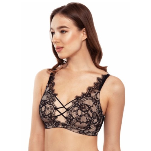 Притягательная модель бюстгальтера с плотным французским кружевом и формованными чашечками, придающими груди идеальную форму. Выполнен в телесном цвете с контрастным черным кружевом в оригинальном дизайне со шнуровкой. Коллекция Осень/Зима 2020.