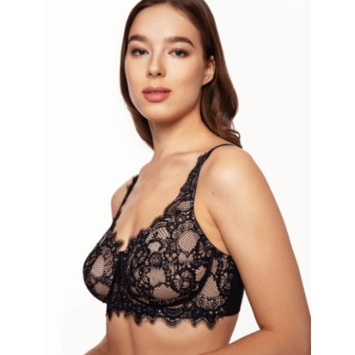 Неповторимый бюстгальтер с плотным французским кружевом и формованными чашечками, придающими груди идеальную форму. Выполнен в телесном цвете с контрастным черным кружевом. Коллекция Осень/Зима 2020.
