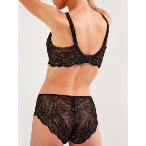 Великолепный ажурный бюстгальтер с формованной чашкой в выдержанном стиле марки Megami с изящным сочетанием кружева и закрытого дизайна. Модель выполнена в черном цвете с подкладом телесного цвета.