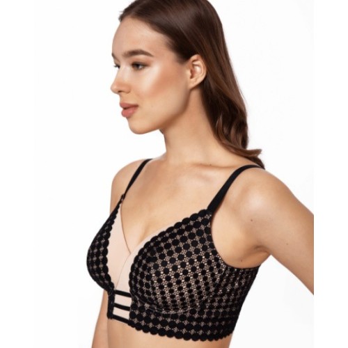 Невероятный эффектный бюстгальтер в смелом исполнении. Модель имеет формованные чашечки и выполнена без использования косточек. Используется черный и телесный цвета. Коллекция Осень/Зима 2020.