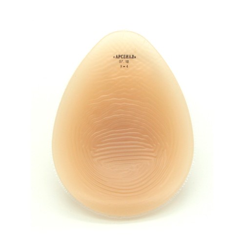 Симметричный экзопротез естественной формы для возмещения молочной железы после операции. Выполнен с учетом анатомических особенностей тела и проведенной операции. Снабжен дополнительно мягким углублением с внутренней стороны.