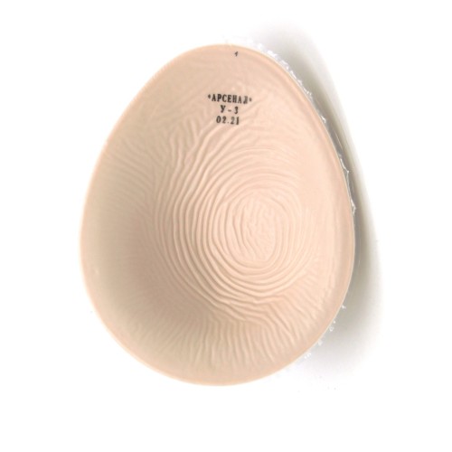 Симметричный экзопротез естественной формы для возмещения молочной железы после операции. Выполнен с учетом анатомических особенностей тела и проведенной операции. Снабжен дополнительно впадиной с внутренней стороны.