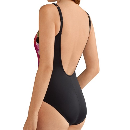 Яркий закрытый купальник с притягательным сочетанием иссиня черного и крупных тропических цветов. Модель Весна 2018.