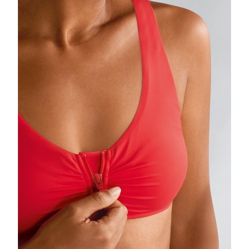 Топ дополнен чашечками с карманами для удержания и максимальной фиксации протеза. Удобная застежка спереди помогает удобно поправить и расположить протез. Мягкие широкие бретельки хорошо держат вес груди, облегчают нагрузку на спину. Они удобно регулируются по длине и не натирают плеч