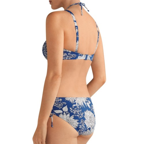 Женственный раздельный купальник яркого синего цвета деним с крупными белыми цветами. Яркая летняя ткань дополняет пляжный фасон этого элегантного бикини. Модель Весна 2018.