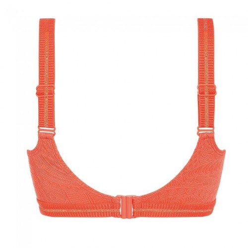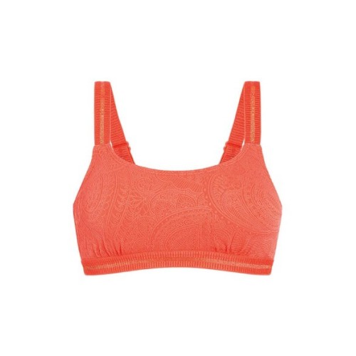 Яркий раздельный купальник необычного и притягательного кораллового цвета с восточным орнаментом того же цвета, делающим ткань фактурной. Удобная летняя модель для пляжа или бассейна.