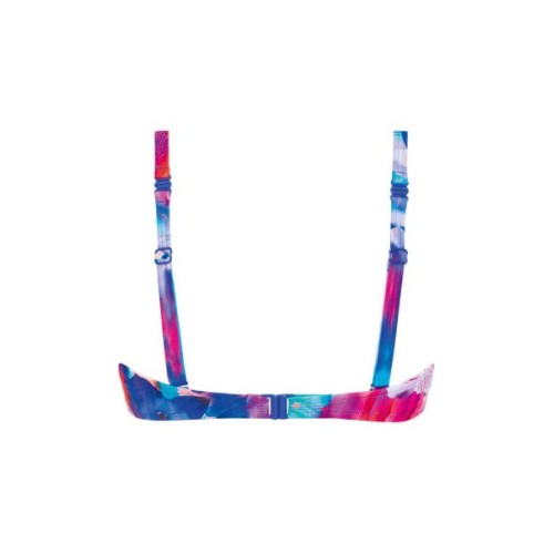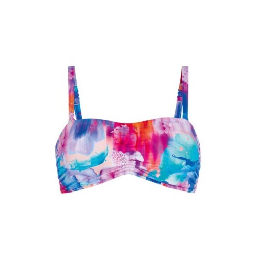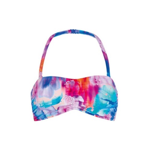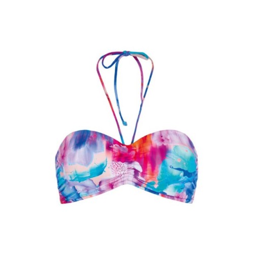 Яркий летний раздельный купальник с акварельными разноцветными красками. Лиф купальника снабжен бретелями на плечах, а также может одеваться через голову.