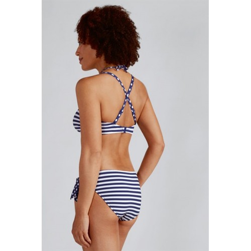 Элегантный открытый купальник в ретро стиле с приятным сочетанием полосок и ткани в горошек. Высокий лиф поможет тщательно скрыть следы операции, придавая чувство надежности и уверенности в себе. Драпировка на груди дополнительно закрепляют протезы. Мягкие чашечки купальника поддерживают грудь и протез, корректируя именно те участки, которые нуждаются в этом. Двойные цветные бретели на плечи, а также через шею надежно фиксируют лиф на теле.