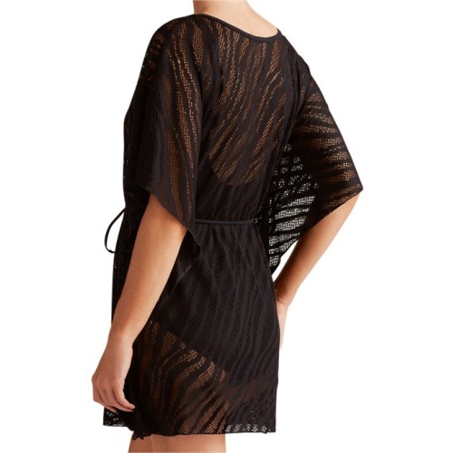 Легкая черная туника для пляжа, защищающая от солнца. Привлекательный свободный крой отлично дополнен летящей полупрозрачной тканью, а в качестве акцента используется тонкий поясок на талии. Туника без втачных рукавов и длиной до середины бедра защищает плечи и спину от палящего солнца.