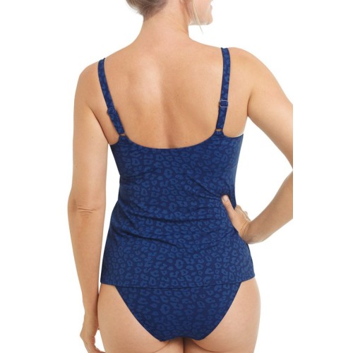 Универсальный и современный купальник-танкини, подкупающий своей простотой и четким силуэтом. Состоит из удобного топа и трусиков. Темно-синий принт отлично дополняет эту модель плавательного костюма.