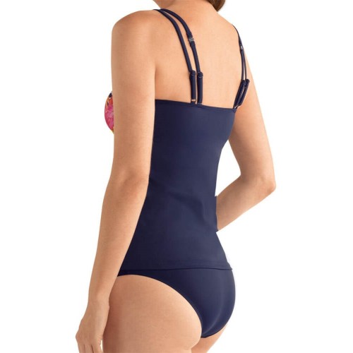 Спинка топа выполнена из основной однотонной ткани этой модели. Неглубокий вырез до середины спины обеспечивает максимальный комфорт и удобство на пляже и в бассейне.