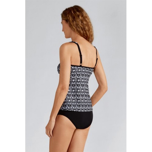 Элегантный купальник-танкини в классическом черно-белом цвете с пестрым принтом на топе. Квадратный вырез топа поможет тщательно скрыть следы операции, придавая чувство надежности и уверенности в себе. Удобные скрытые кармашки крепко фиксируют протезы. Мягкие чашечки купальника поддерживают грудь и протез, корректируя именно те участки, которые нуждаются в этом.