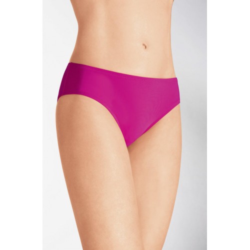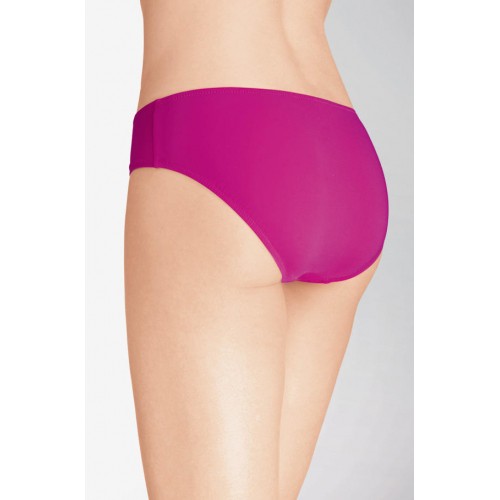 Экстравагантный купальник-танкини в ярком и насыщенном пурпурным цвете обладает скромным облегающим силуэтом и высоким вырезом. Оригинальной деталью служит пояс-драпировка под лифом, украшенный широкой пряжкой. Высокий вырез лифа и закрытая спина отлично поддерживают грудь и протез и скрывают недостатки.
