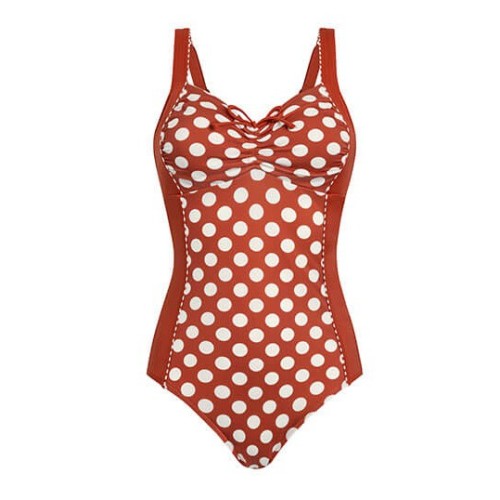 Изящный цельный купальник в ретро стиле в броском красном цвете в крупный горох. Купальник обладает выделенной центральной частью на однотонном фоне, что добавляет стройности фигуре.
