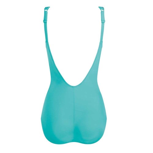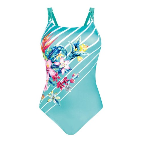 Яркий летний купальник в солнечном бирюзовом цвете с крупными тропическими цветами. Бирюзовый цвет отлично сочетается с цветастым принтом, а диагональные белые полосы добавляют свежести. Модель имеет высокий вырез, скрывающий следы операции. Подобная модель купальника снабжена специальными кармашками в чашечках лифа, которые плотно фиксируют протез.