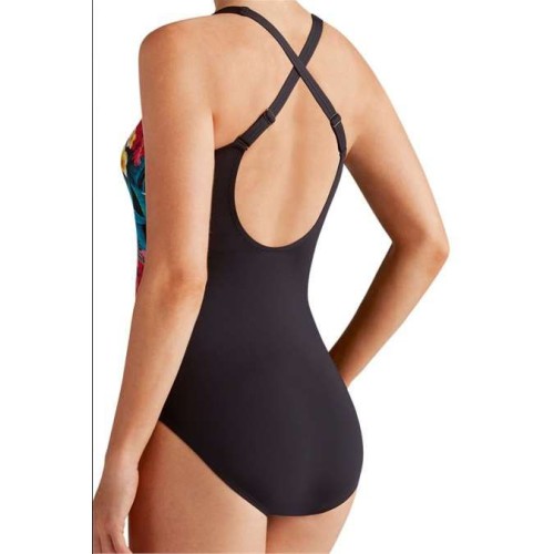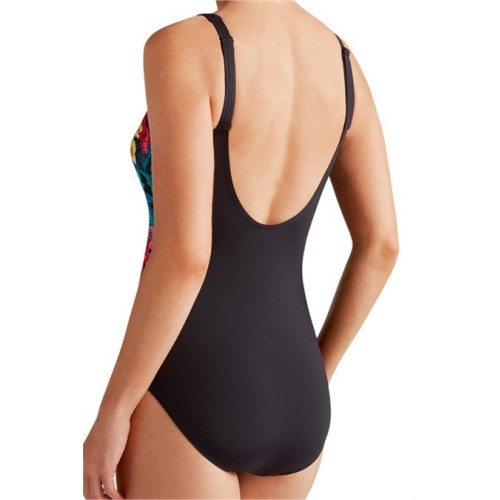 Закрытый купальник в ярких летних цветах с растительным принтом. Цветная передняя часть дополнена V-образным вырезом с черным кантом. Спинка с глубоким вырезом выполнена в одном черном цвете. Плотные чашечки в лифе удобно фиксируют грудь и протез, для которого предусмотрены специальные кармашки.