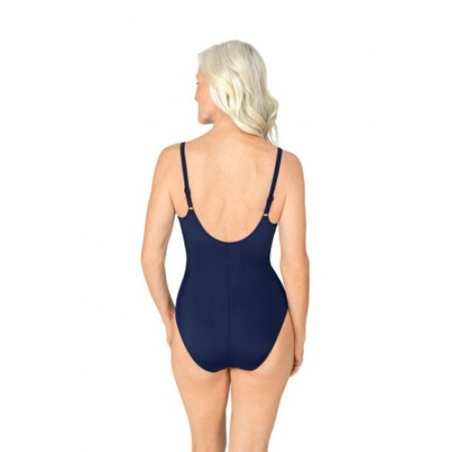 Закрытый темно-синий купальник с пестрым принтом из красивых цветов гибискуса и полосок. Модель 2022. Спинка с глубоким вырезом выполнена в одном темно-синем цвете. В лифе купальника вставлены мягкие чашечки со специальными кармашками для комфортной фиксации протеза. Хорошая фиксация протеза поможет чувствовать себя уверенно на пляже и в бассейне.