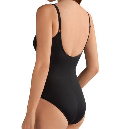 Современный цельный купальник с вытачками и вшитыми чашечками идельно садится по фигуре, поддерживает грудь и дает стройнящий эффект. Мягкие чашечки снабжены кармашками, удерживающими протез, полностью фиксируя его. Вырез имеет изысканную форму, он не слишком глубок и скрывает возможные следы операции. Вырез плавно переходит в широкие бретели, которые дают максимальную поддержку большой груди, облегчая нагрузку на спину. Они регулируются по длине сзади.