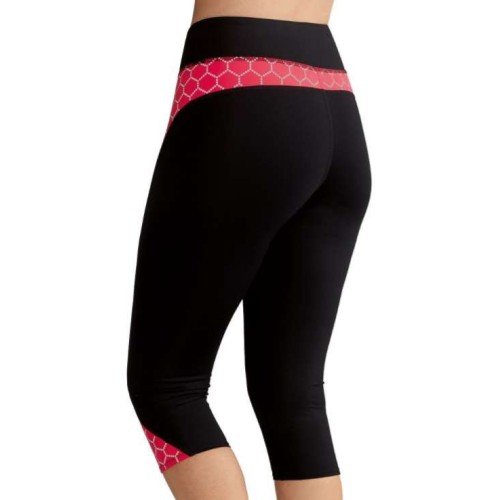 Эластичные облегающие капри чуть ниже колена для спорта из черной ткани с яркими вставками. Это стильная и современная модель с красивым и функциональным дизайном.