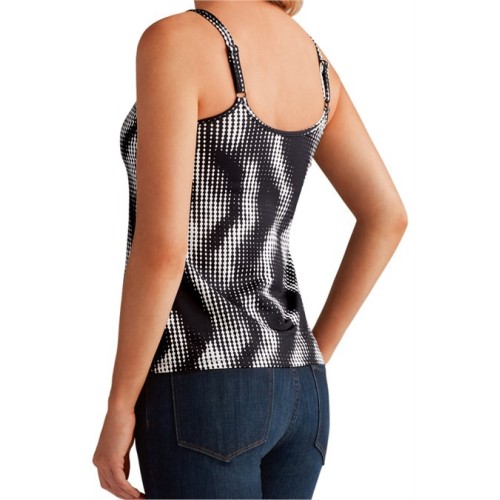 Простой и элегантный топ в черно-белых цветах с бретельками-спагетти. Универсальная модель, которая отлично смотрится как в сочетании с пиджаком или блейзером, так и интересна сама по себе. Топ снабжен вшитыми чашечками, которые не выделяются под тканью, но дают необходимую поддержку груди и протезу. Каждая из чашечек снабжена специальным карманом для фиксации экзопротеза.