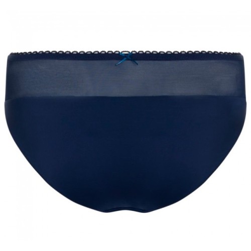 Трусики состоят из непрозрачной синей середины с боками оформленными кружевом с ажурной окантовкой. Задняя сторона выполнена в однотонном основном цвете.