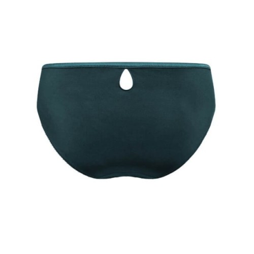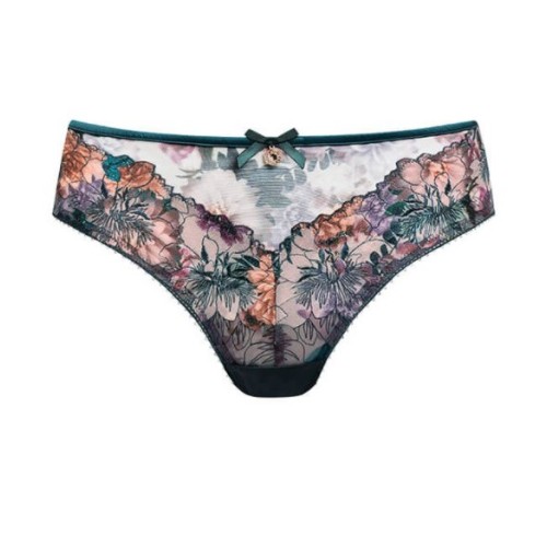 Классические трусики слипы с цветной передней частью, представляющей собой сочетание плотной и полупрозрачной ткани с цветочным принтом и задней частью из плотной эластичной ткани нефритового цвета.